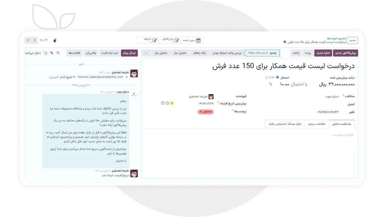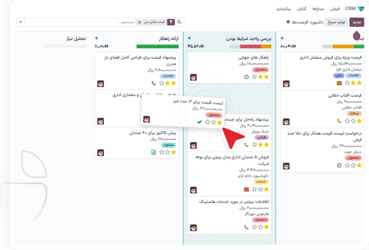 در نرم‌افزار CRM سازمان‌یار، هر فرصت به‌صورت یک کارت نمایش داده می‌شود و شامل اطلاعات کلیدی از جمله ارزش پیش‌بینی‌شده، وضعیت فعلی، مشتری مرتبط و مسئول فروش است.