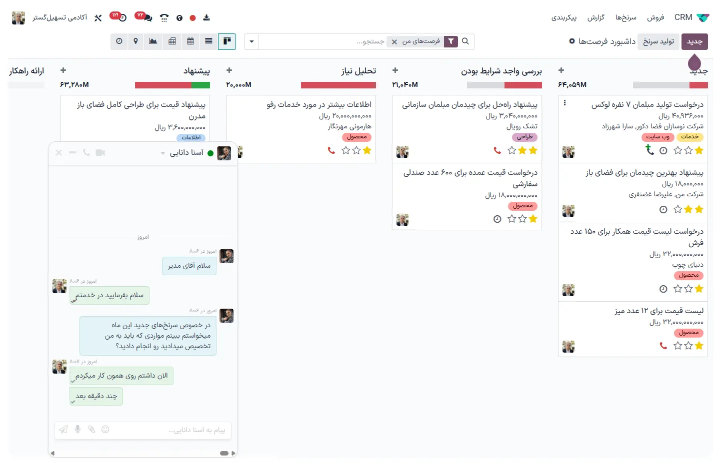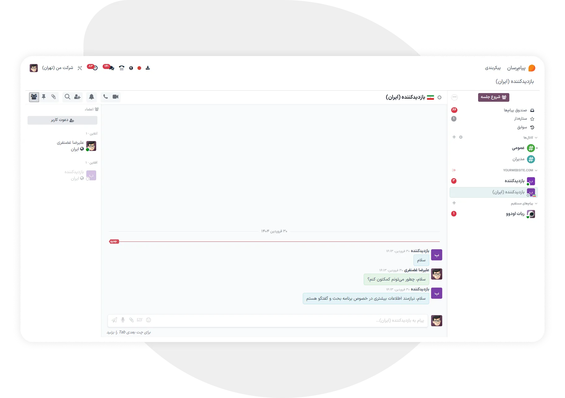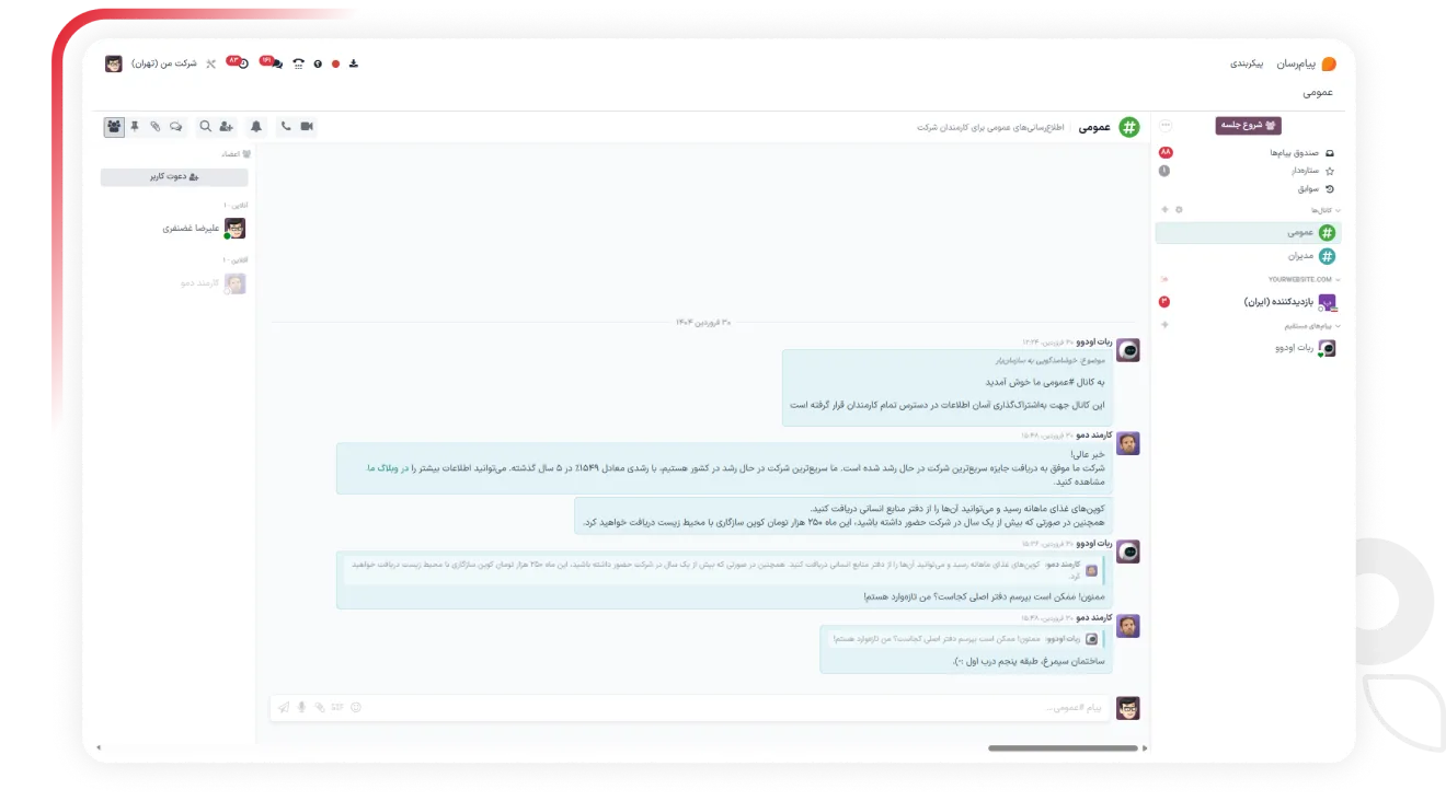 پیامرسان فراتر از یک ابزار پیامرسانی ساده است؛ با این یک سیستم ارتباطی هوشمند تمامی کانالهای ارتباطی شما، از چتهای خصوصی و فوری با همکاران گرفته تا یکپارچگی کامل با واتساپ برای تعامل مؤثر با مشتریان، سیستم چت زنده برای پشتیبانی سریع وبسایت، و همچنین قابلیتهای تماس صوتی و کنفرانس ویدیویی با کیفیت بالا، همگی به صورت یکپارچه در اختیار شما هستند.
