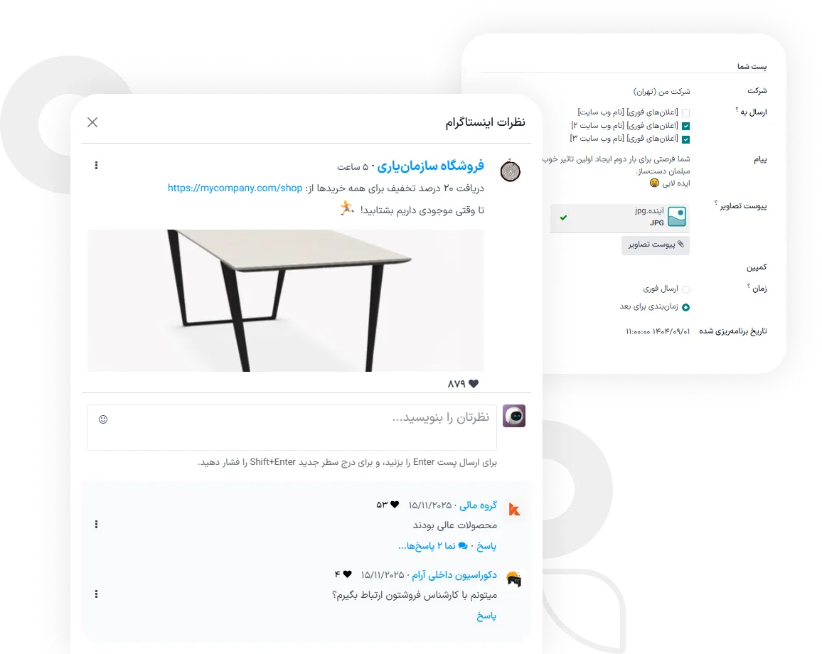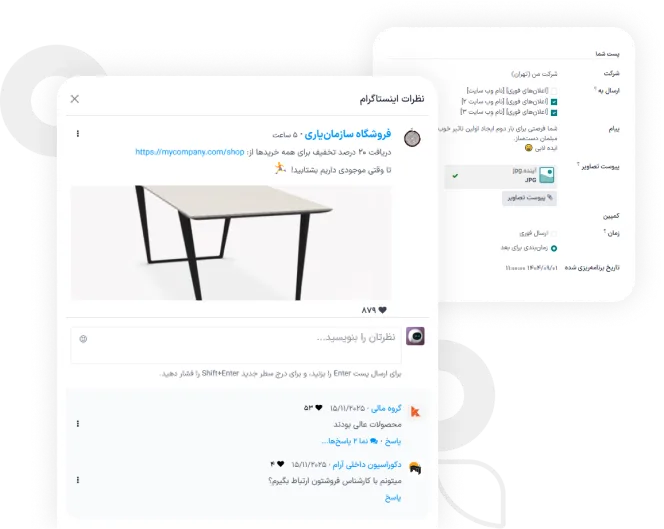 مشتریان جدید پیدا کنید و با کاربران تعامل کنید. حضور هوشمند در شبکههای اجتماعی تنها یک گزینه نیست، بلکه ضرورتی برای رشد و اعتمادسازی برند است. افزایش آگاهی از برند، جذب مشتریان جدید، حفظ ارتباط با مشتریان فعلی، و ارسال پیامهای عمومی و پشتیبانی از طریق شبکههای اجتماعی همگی در بستری یکپارچه ممکن میشود.