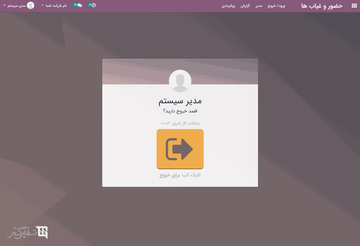 در این ماژول، حضور کارمندان بر اساس عمل ورود / خروج کارمند قابل ثبت است.