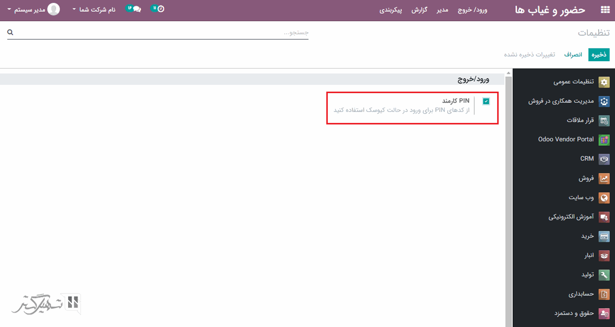 گزینه دیگر ورود/ خروج استفاده از پین است. برای این کار باید پیکربندی را از طریق منوی حضور و غیاب فعال کنیم.