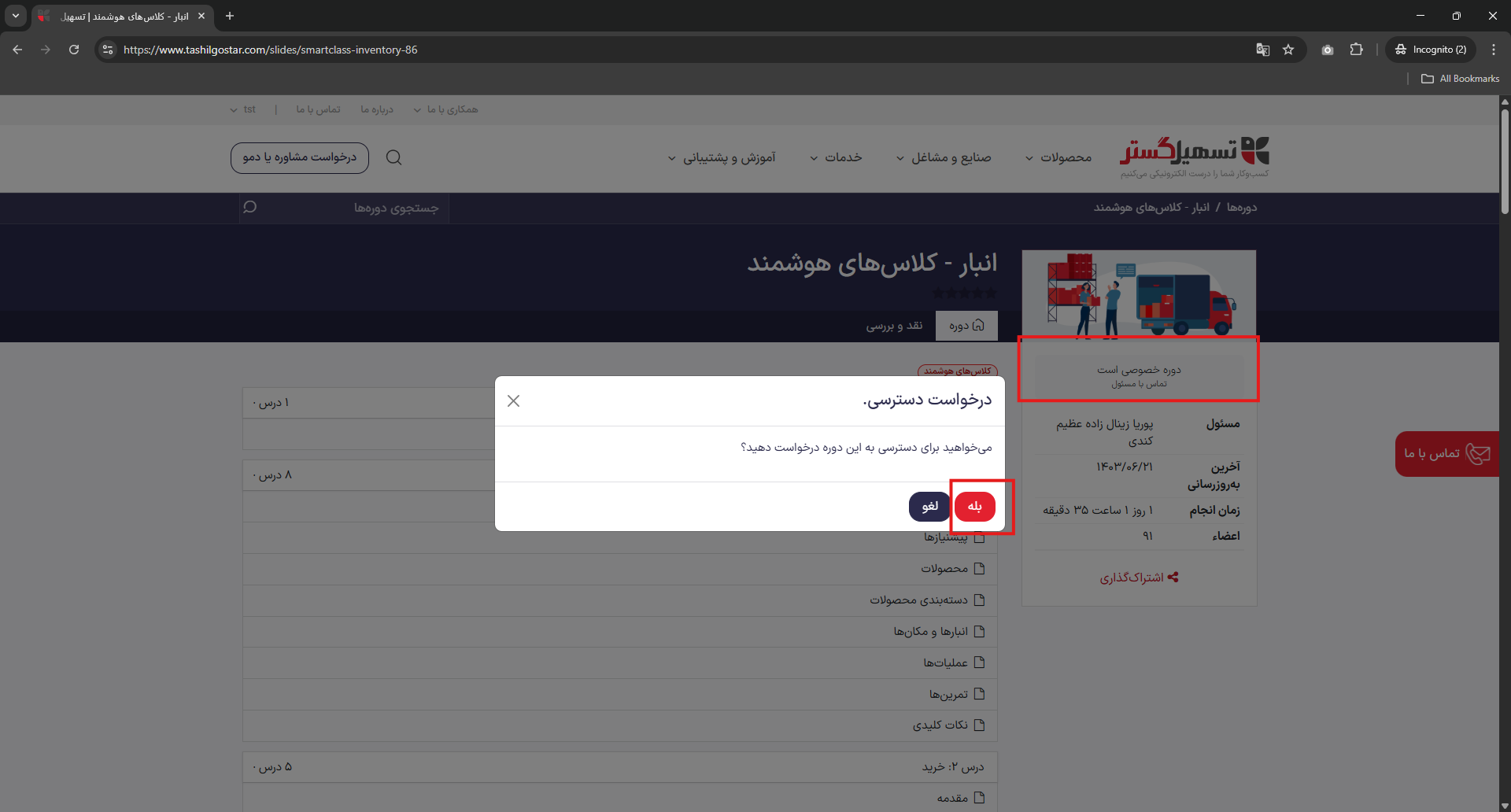 از آنجا که این دورهها جزء منابع آموزشی عمومی نیستند، جهت دسترسی به این دورهها، ابتدا باید درخواست خود را ثبت فرمایید. توجه داشته باشید که برای ثبت درخواست، لازم است ابتدا وارد حساب کاربری خود در سایت تسهیلگستر شده باشید.