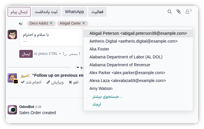 در اودوو هر پیام (ایمیل) که از داخل رکورد میفرستادیم برای تمام فالوئرهای همان رکورد ارسال میشد و امکان انتخاب یا حذف گیرنده نبود. در اودوو ۱۹ هنگام ارسال پیام میتوان انتخاب کرد که پیام برای کدام فالوئرها برود یا نرود.
