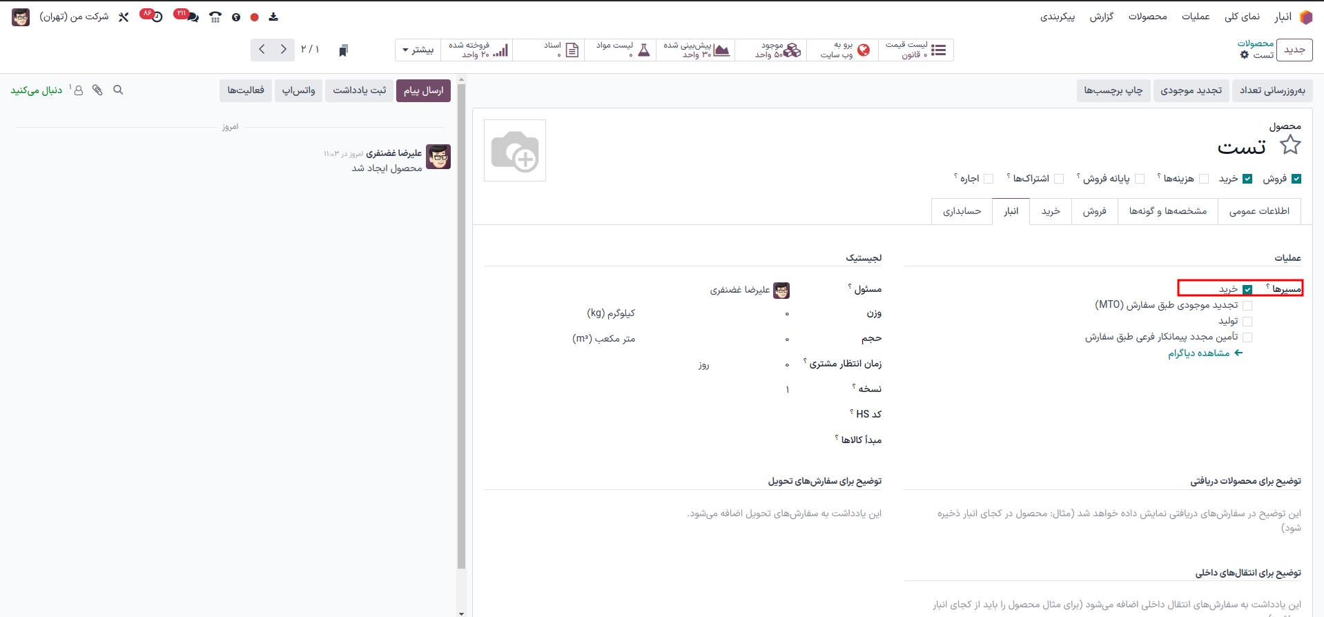 در تب انبار در فیلد مسیرها گزینه "خرید" را تیک بزنید.