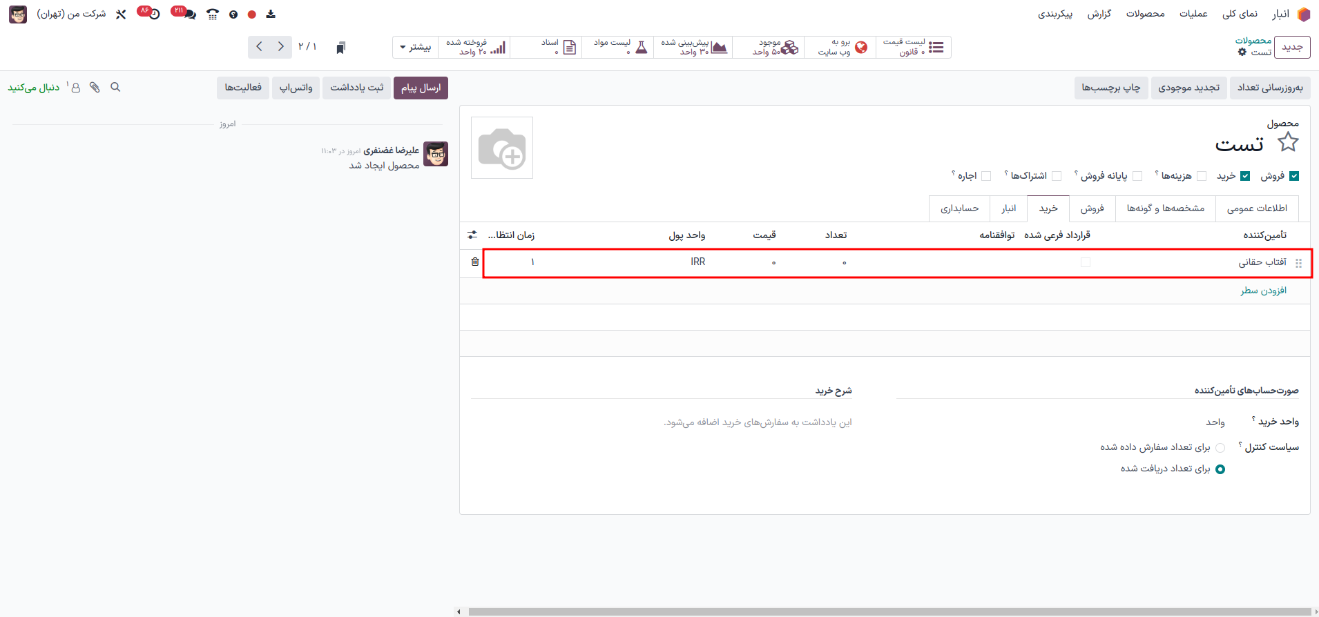 در تب خرید محصول مورد نظر حداقل یک تامین کننده تعریف کنید.