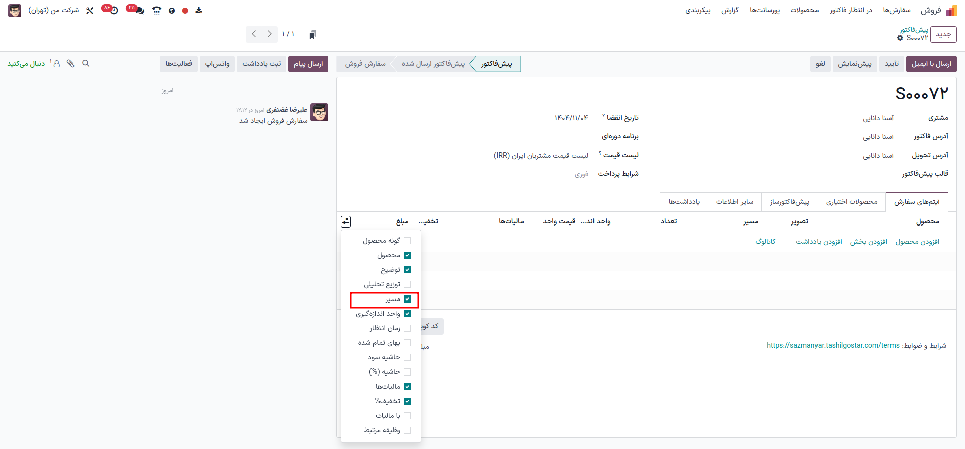 سپس در هنگام سفارش فروش در سطر سفارش فروش فیلد مسیر را قابل نمایش کنید.