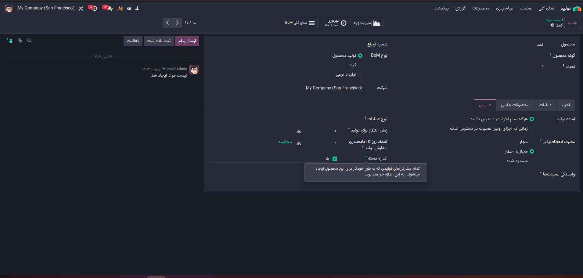 با استفاده از این قابلیت میتوان برای هر لیست مواد مقدار «اندازه دسته تولید» را مشخص کرد.