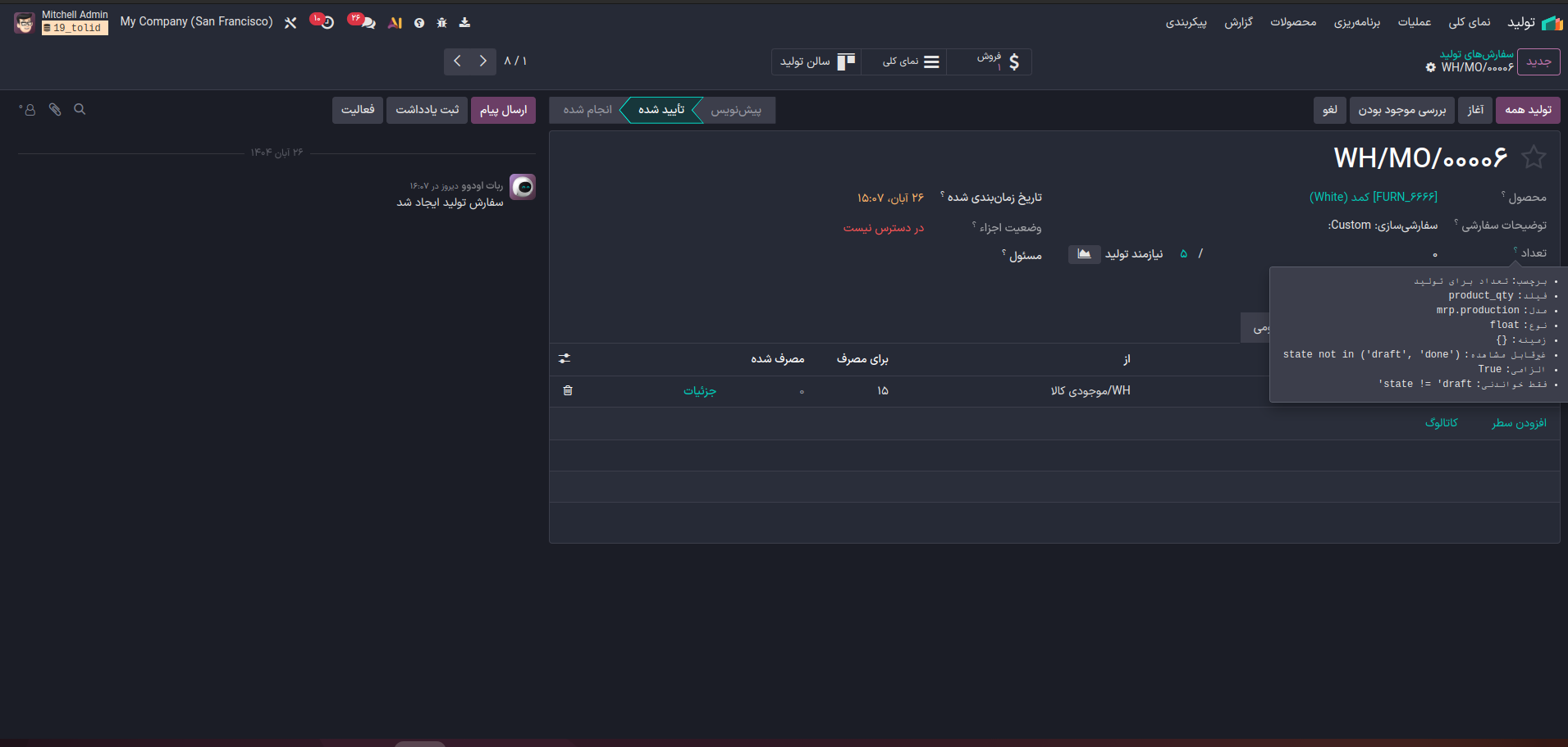 هنگام ایجاد یک سفارش تولید، مقدار فیلد "تعداد" بهصورت خودکار با مقدار "اندازه دسته" پر میشود.