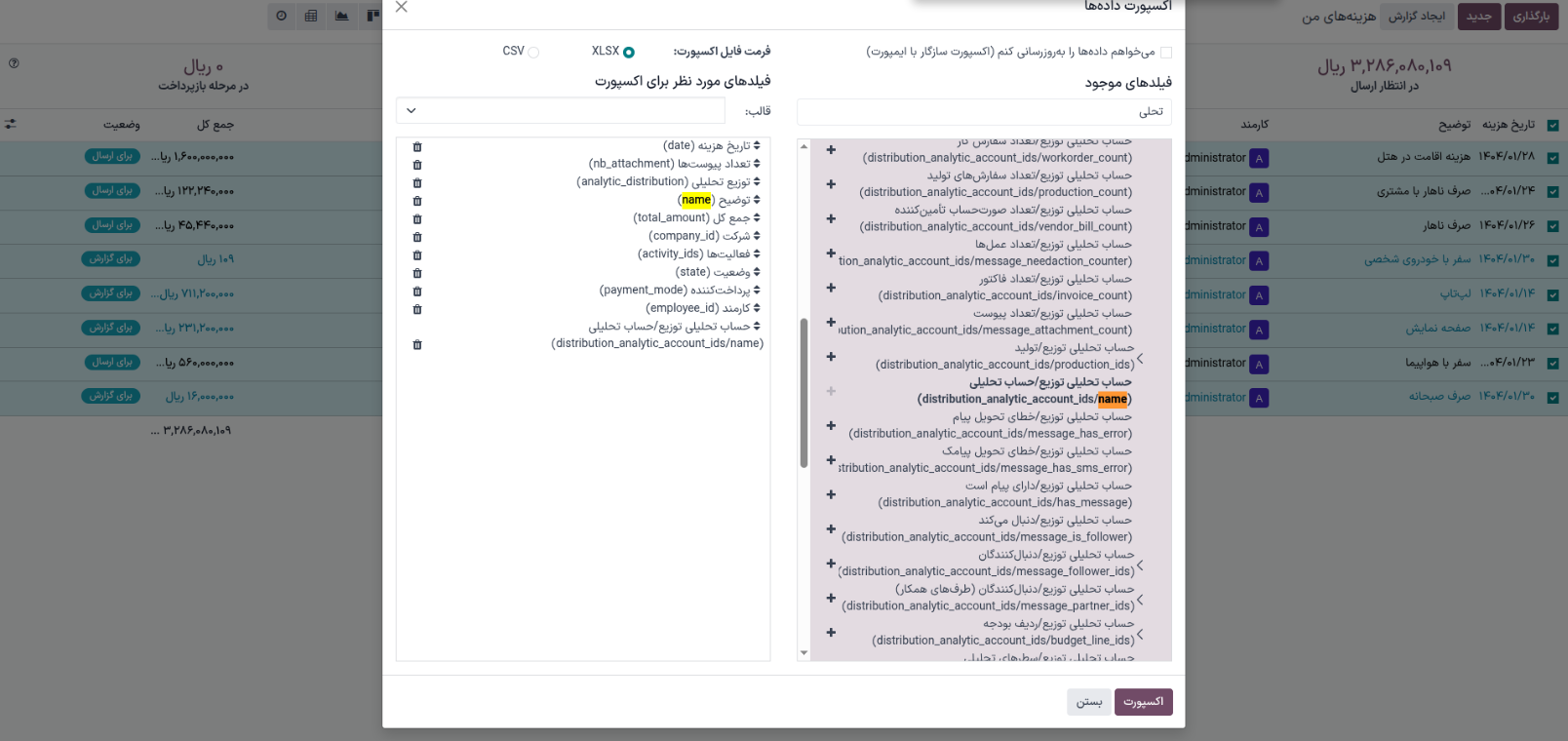 فیلد توزیع تحلیلی یک فیلد از نوع JSON است. برای اینکه در خروجی فایل اکسل اطلاعات دقیقتر و قابلدرکتری از این فیلد در اختیار داشته باشید، میتوانید هنگام اکسپورت دادهها از فیلد توزیع تحلیلی / نام (Analytic Distribution / Name) استفاده کنید.