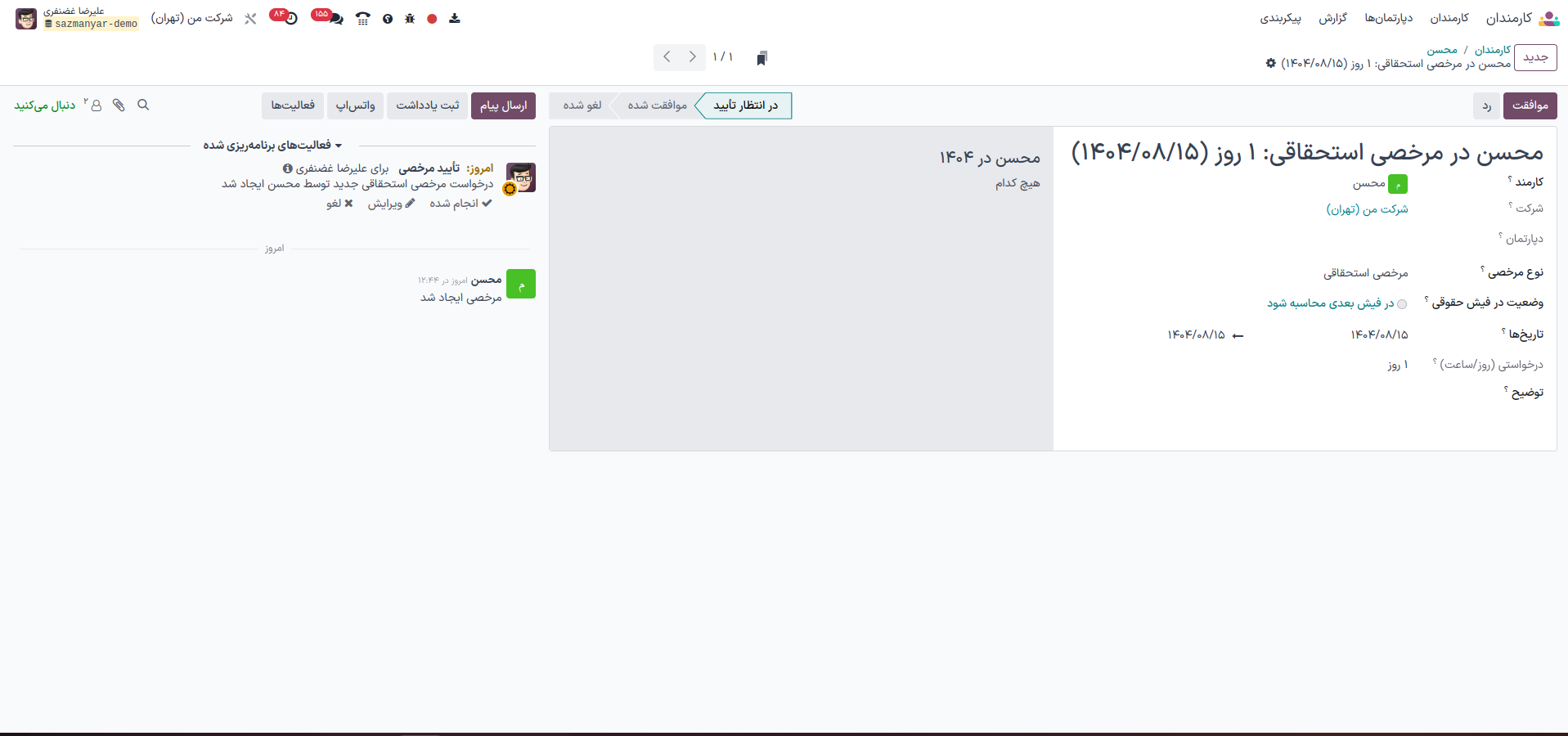 پس از تأیید مدیر، مرخصی نیازمند تأیید نهایی از سمت مسئول منابع انسانی یا کاربری است که در گروه کاربری