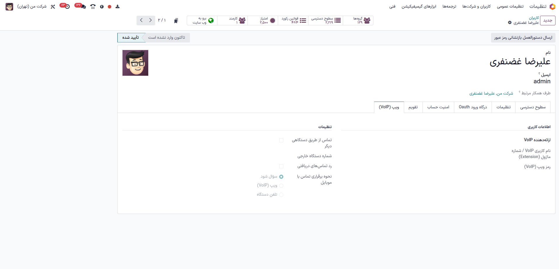 سپس برای هر فرد به قسمت کاربران رفته و کاربر مورد نظر رو انتخاب کرده و تنظیمات مربوط به زیربخش voip رو پر کنید