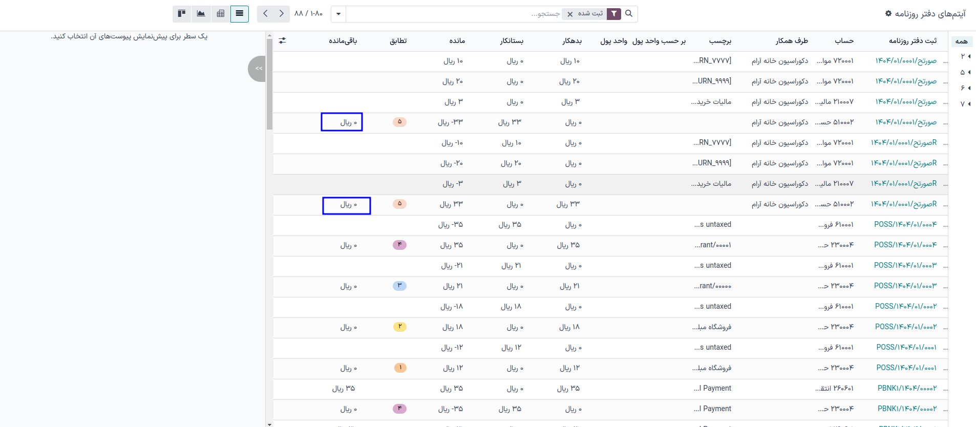 بر اساس منطق سیستم اودوو فیلد «باقیمانده» تنها مقدار بدهی یا بستانکاری تسویهنشده همان سطر را نشان میدهد.