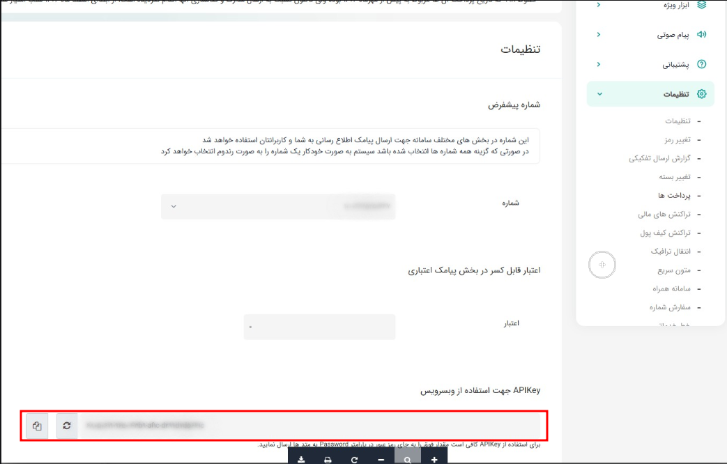 API Key از طریق مسیر «تنظیمات» در پنل پیامکی قابل دریافت است. بنابراین لازم است API Key موجود در پنل را استخراج کرده و در تنظیمات مربوطه جایگزین رمز عبور نمایید (مطابق تصویر پیوست).