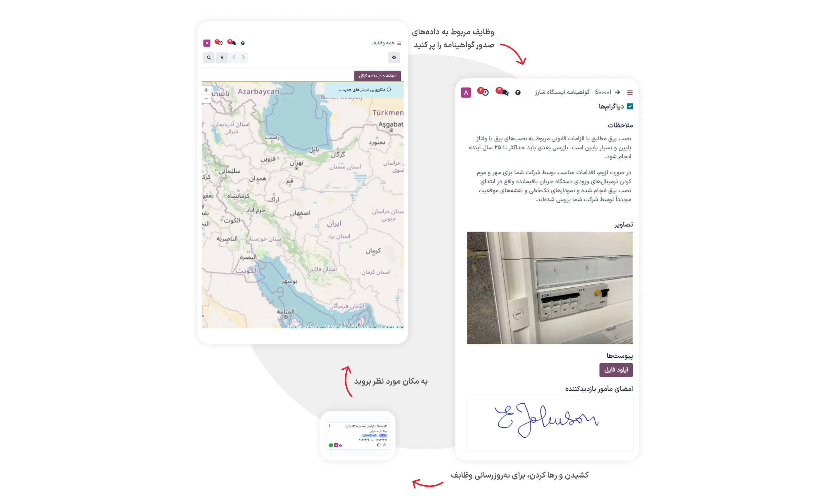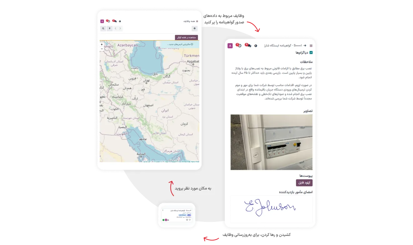 همه چیز همراه کارشناس: کارشناسان خدمات میتوانند تنها با یک کلیک به سمت موقعیت مشتری حرکت کنند، دستورالعملها را بررسی کنند، فرم گواهی را تکمیل نمایند و امضای مشتری را دریافت کنند.