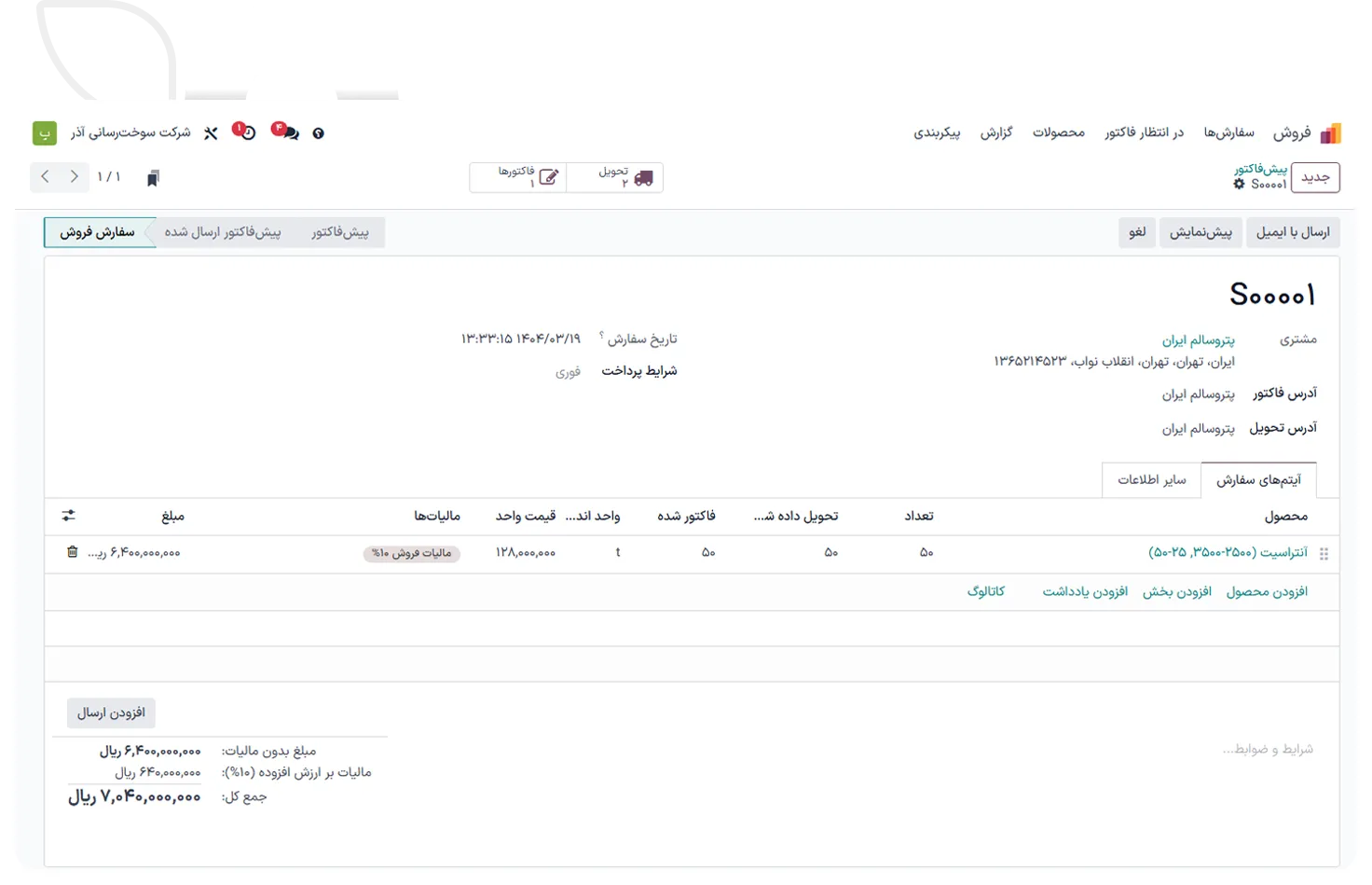 تهیه پیشفاکتور و سفارش فروش در لحظه: با سازمانیار، پیشفاکتورها و سفارشهای فروش را بهسرعت و با دقت بالا ایجاد کنید. قیمتگذاری و مالیاتها بهصورت خودکار و متناسب با هر مشتری اعمال میشوند.