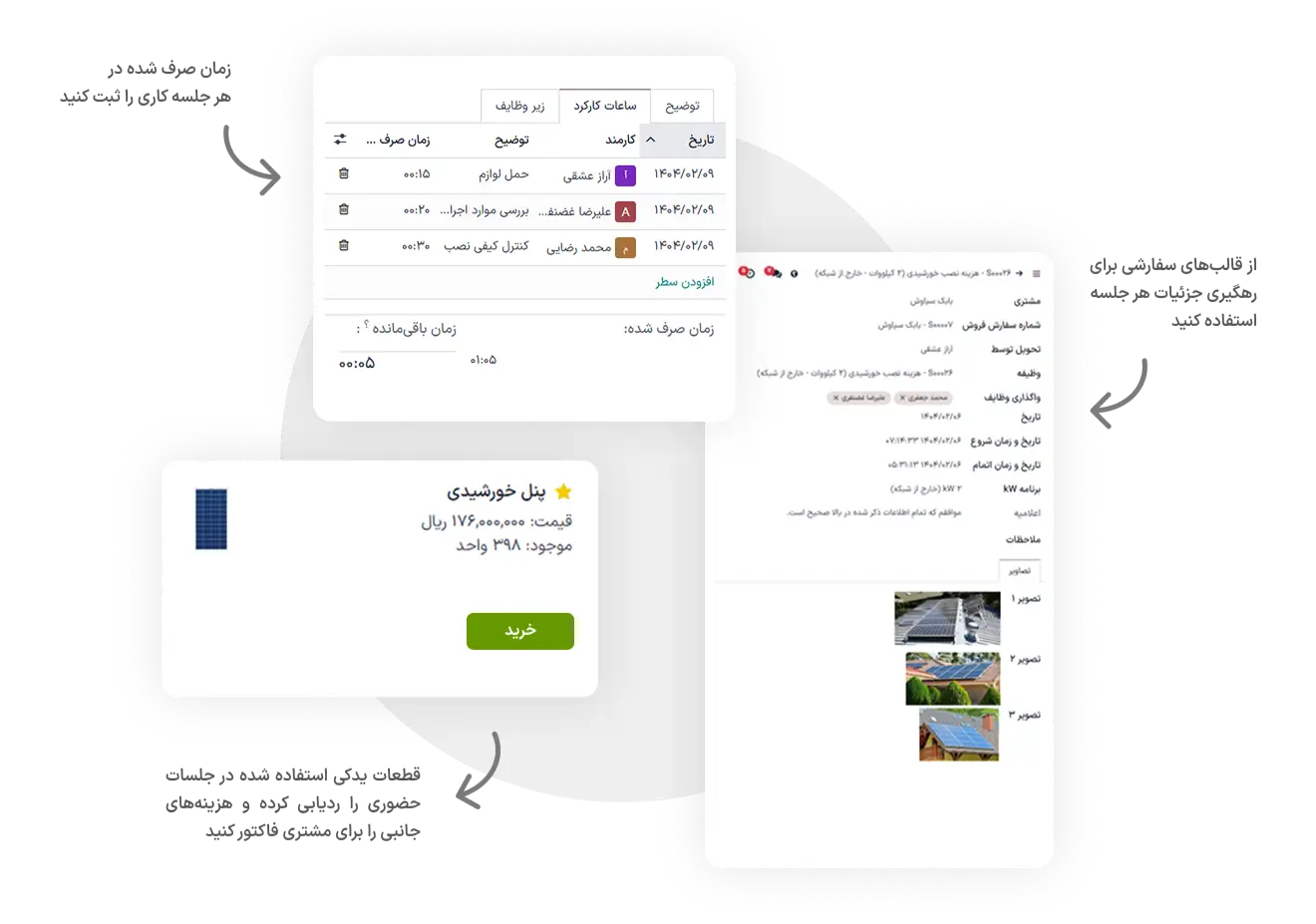 قدرت این راهکار نرمافزاری را برای مدیریت نصب و راهاندازی پنلهای خورشیدی خودتان به رایگان تست کنید، یا دموی اختصاصی رایگان درخواست کنید و از کارشناسان ما راهنمایی بگیرید.